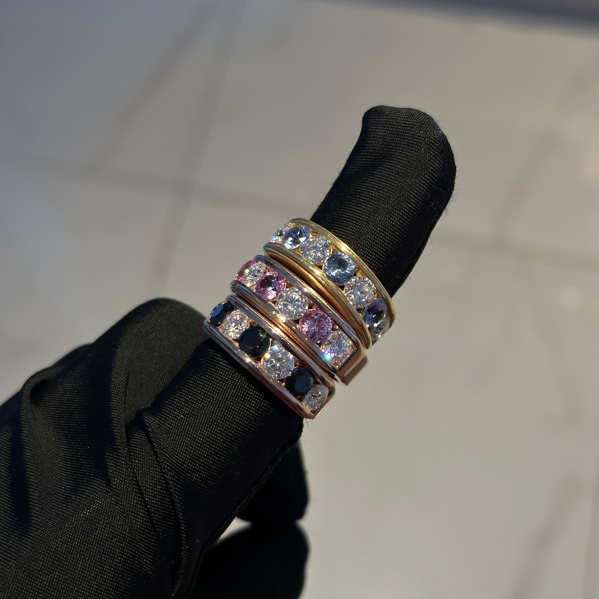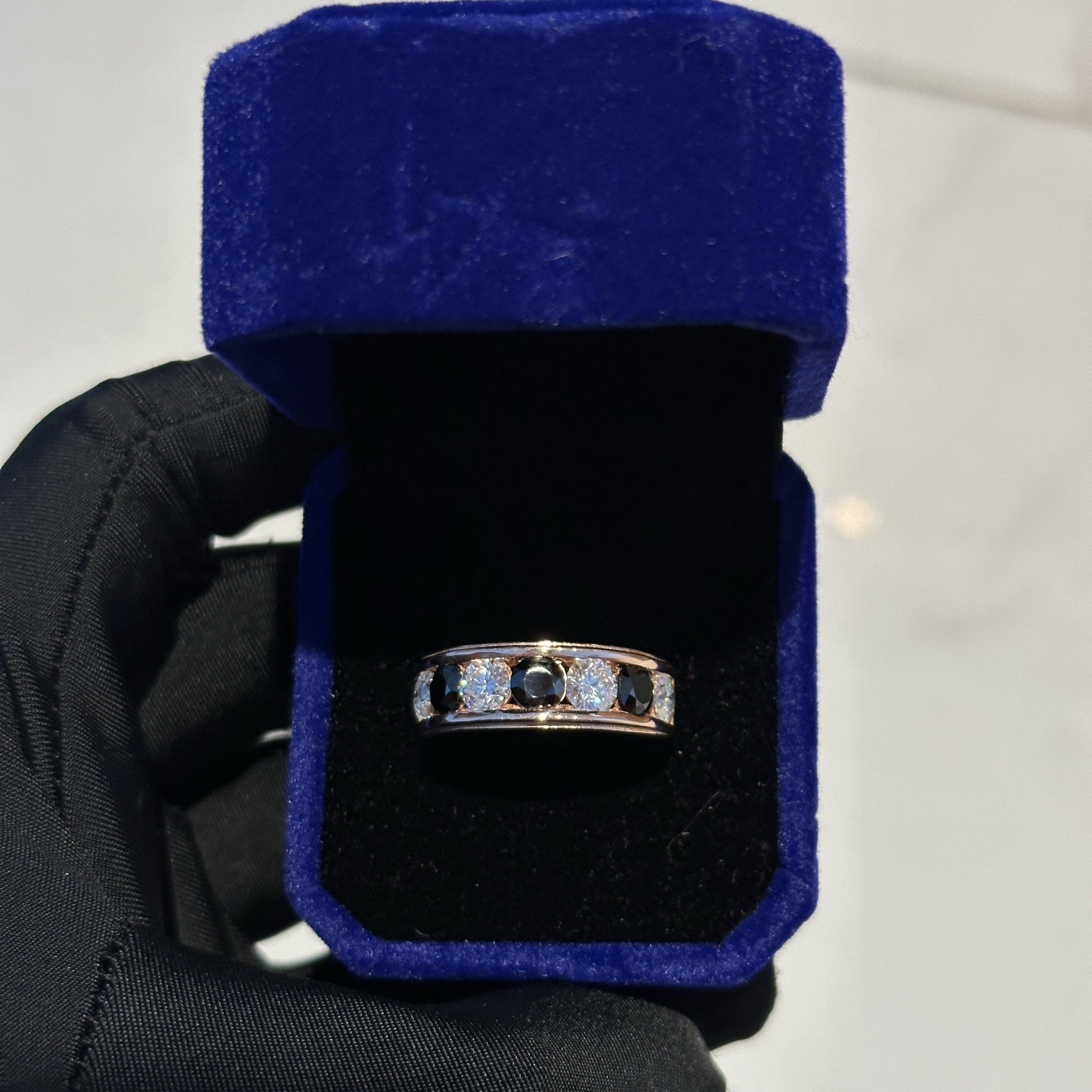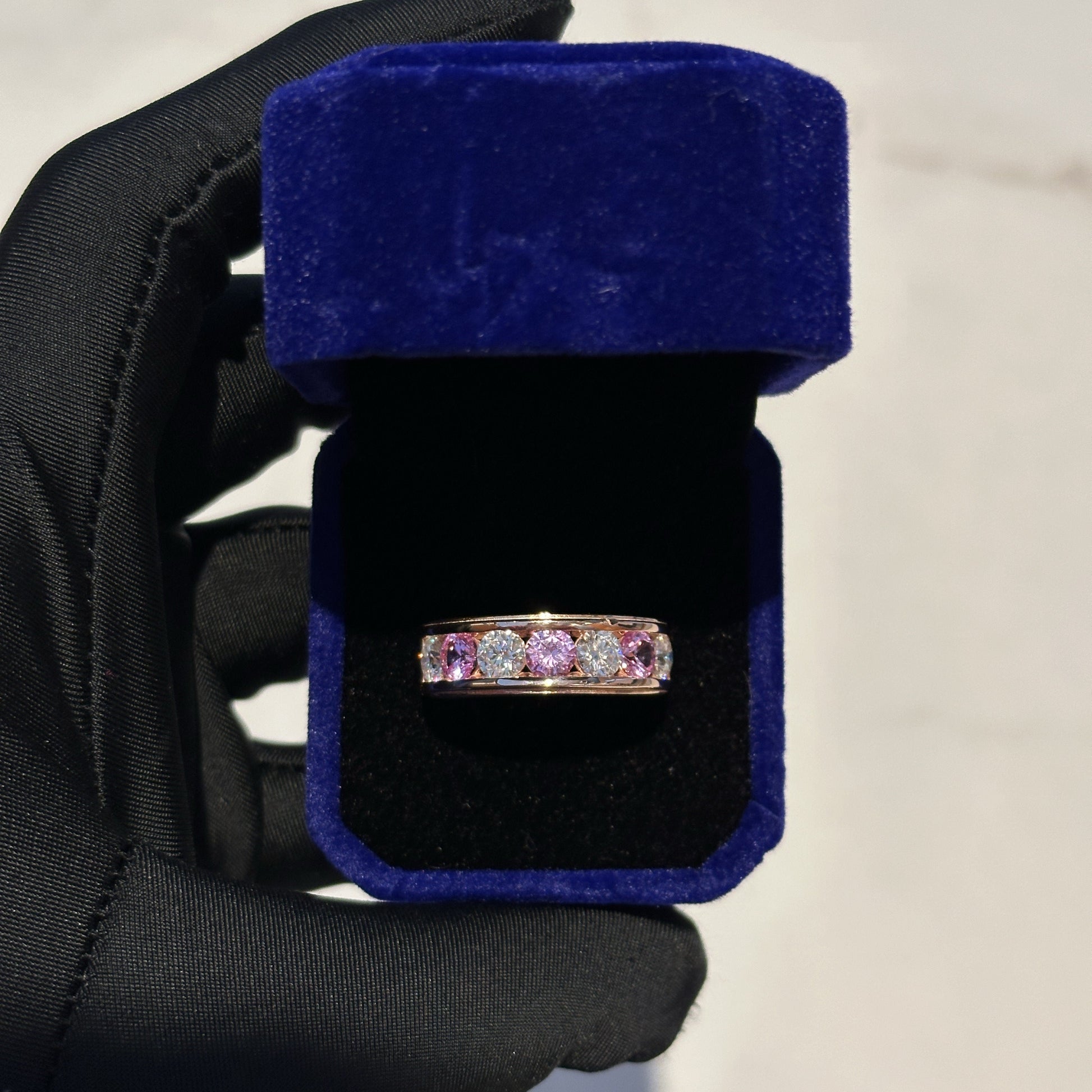 These multi-color bands are set with white moissanite and colored gemstones. Each stone is a half carat each and set with either pink synthetic sapphires or with natural black onyx. Weighing 9.2-9.5 grams and hand set with 3.5ctw stones.
