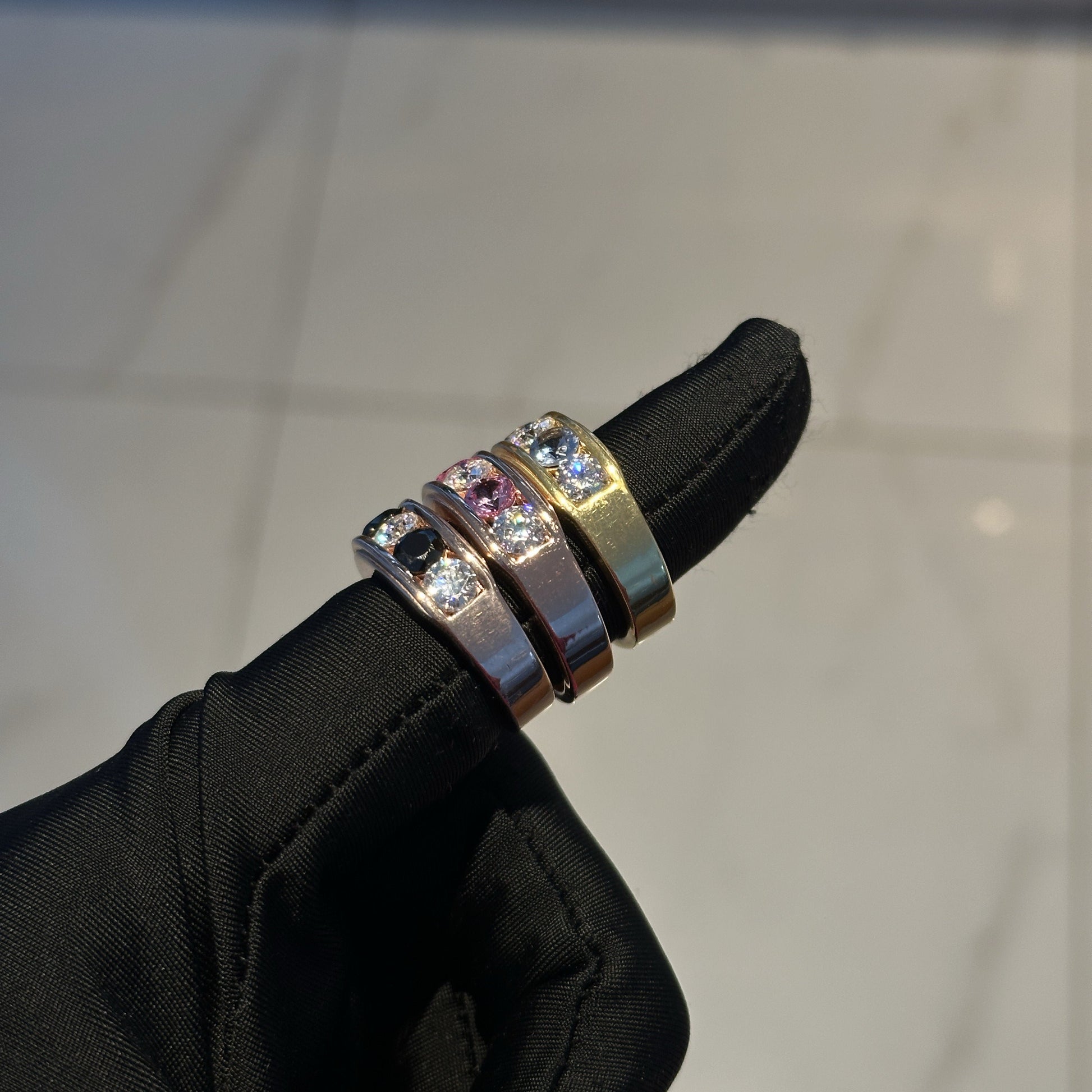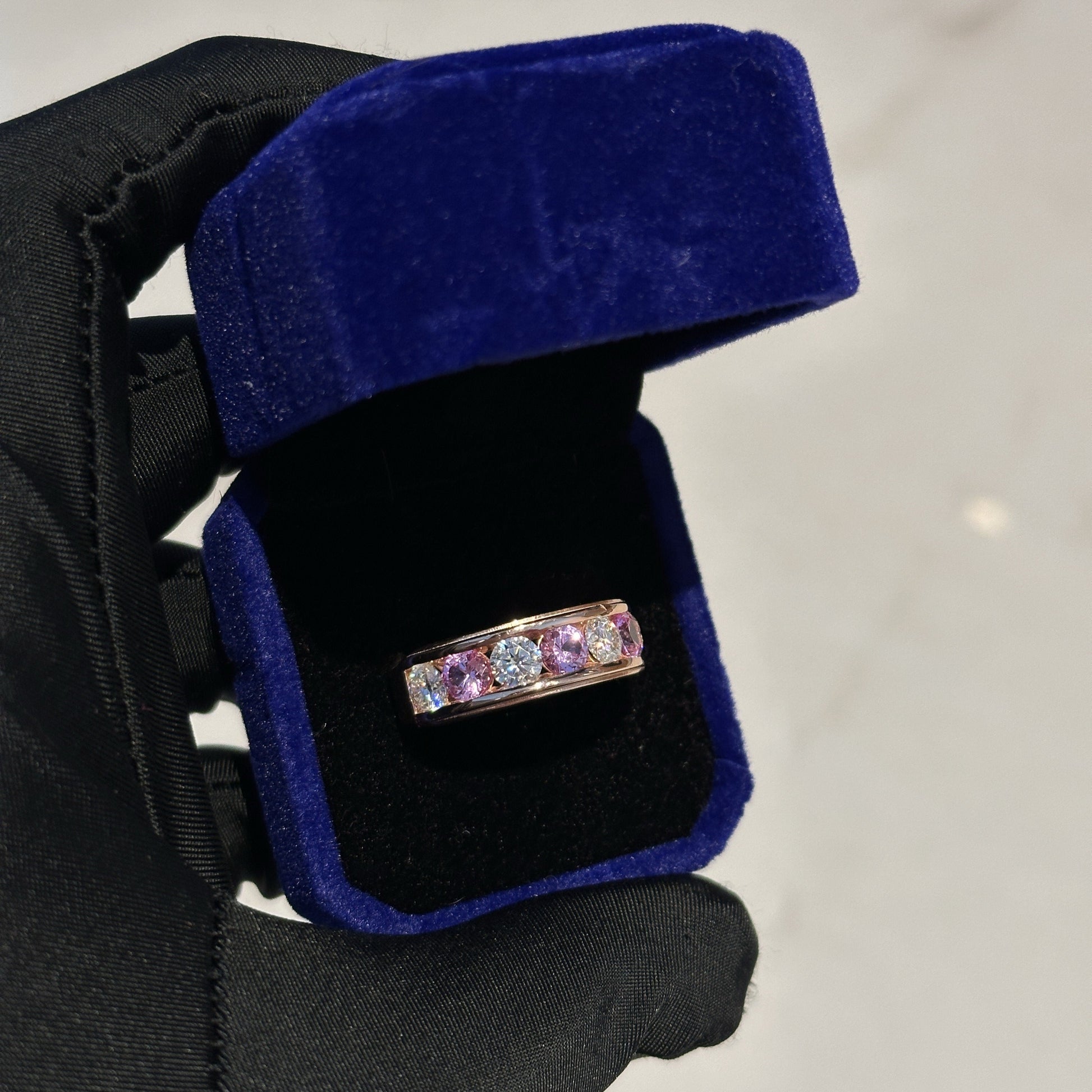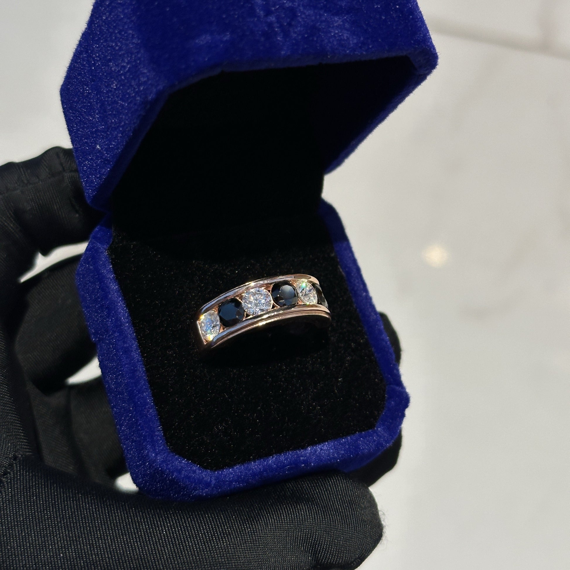 These multi-color bands are set with white moissanite and colored gemstones. Each stone is a half carat each and set with either pink synthetic sapphires or with natural black onyx. Weighing 9.2-9.5 grams and hand set with 3.5ctw stones.