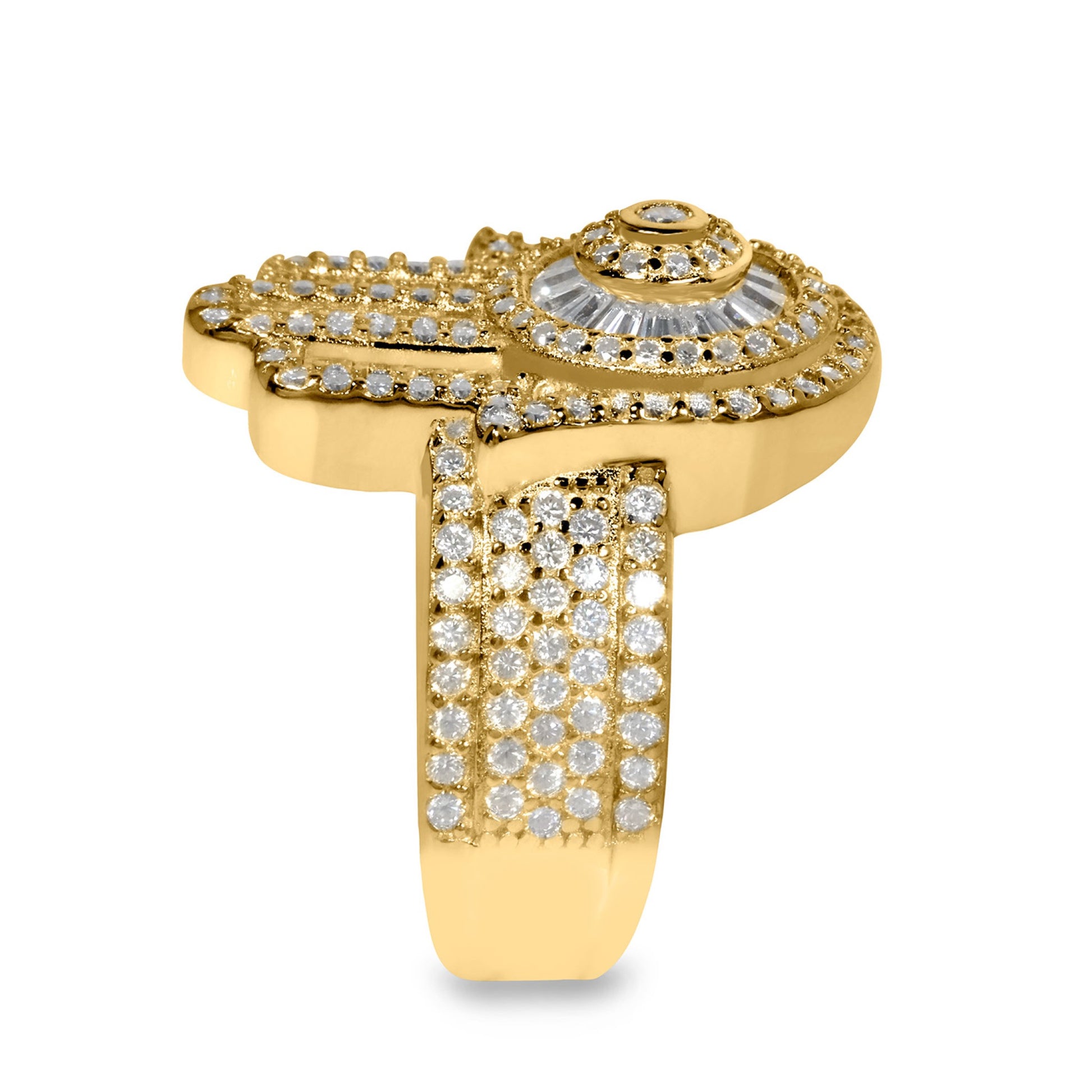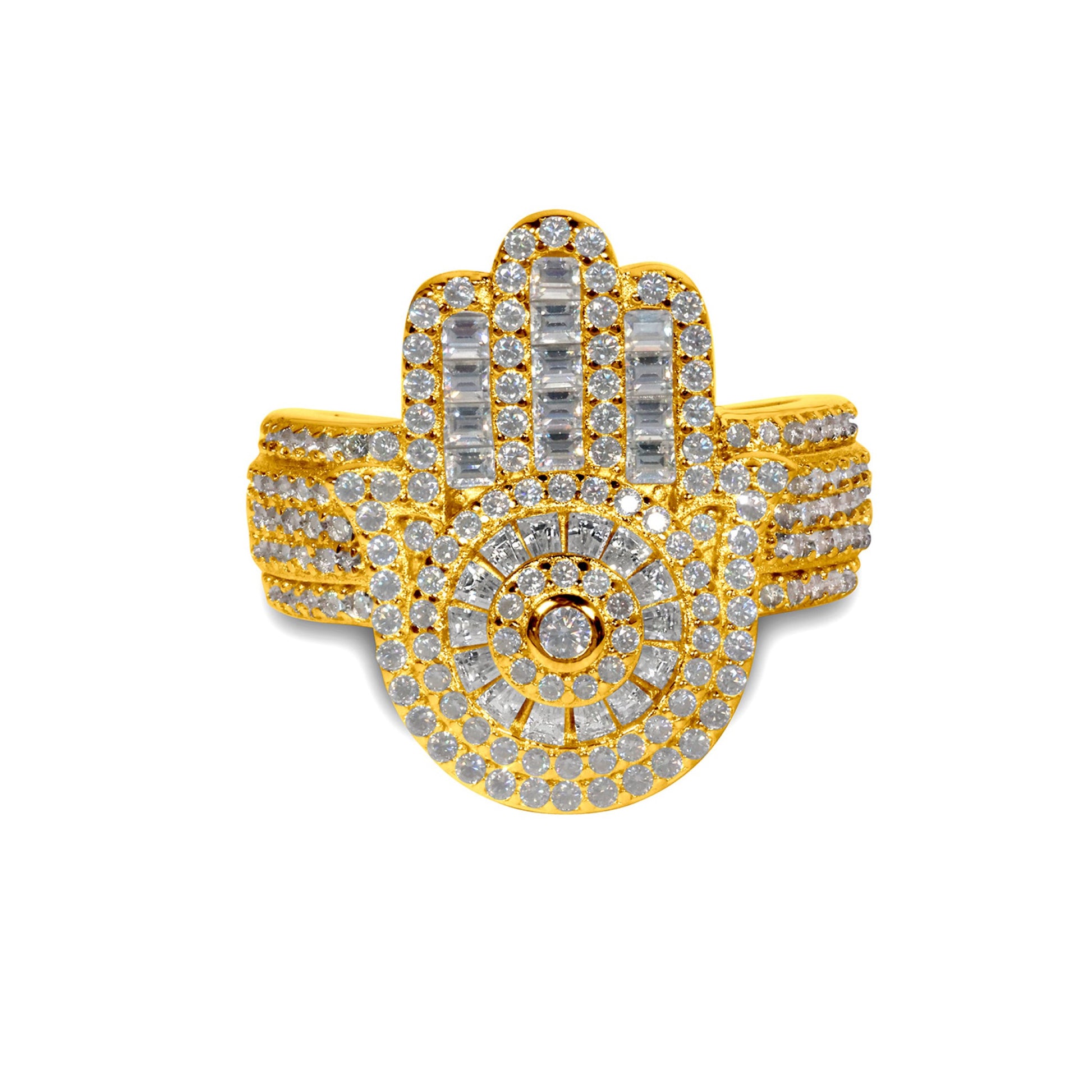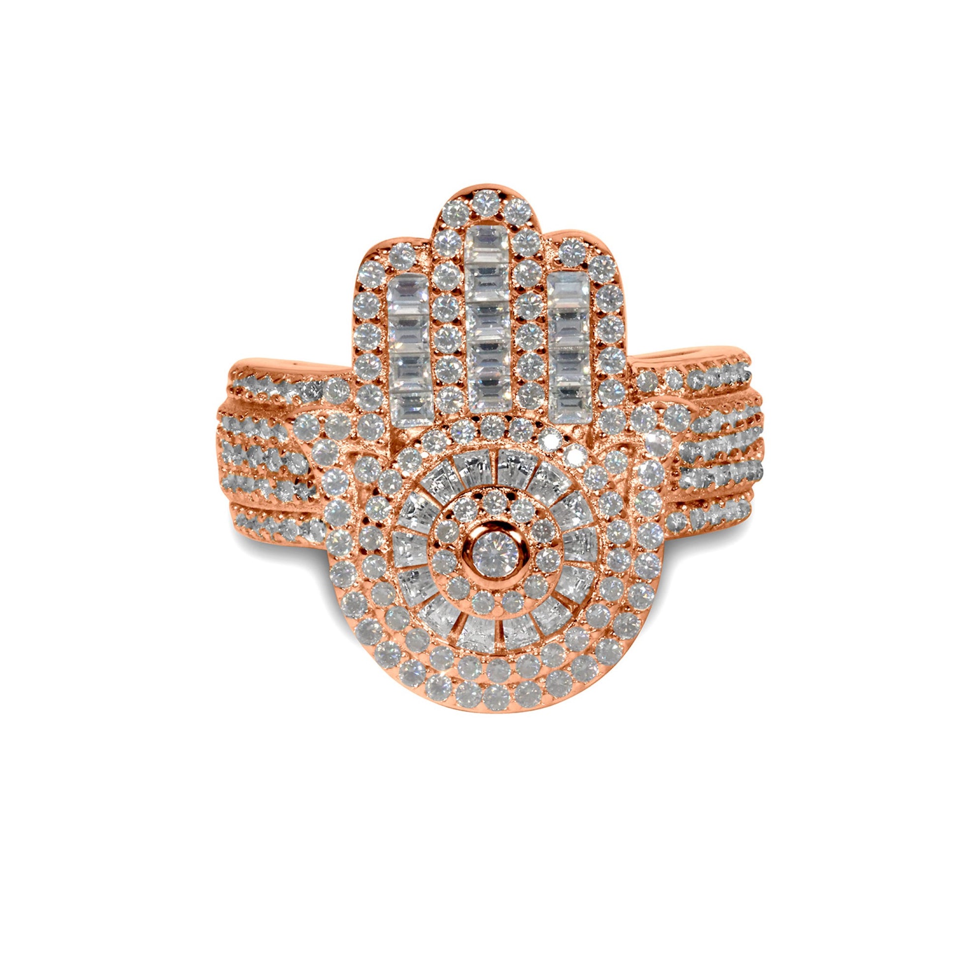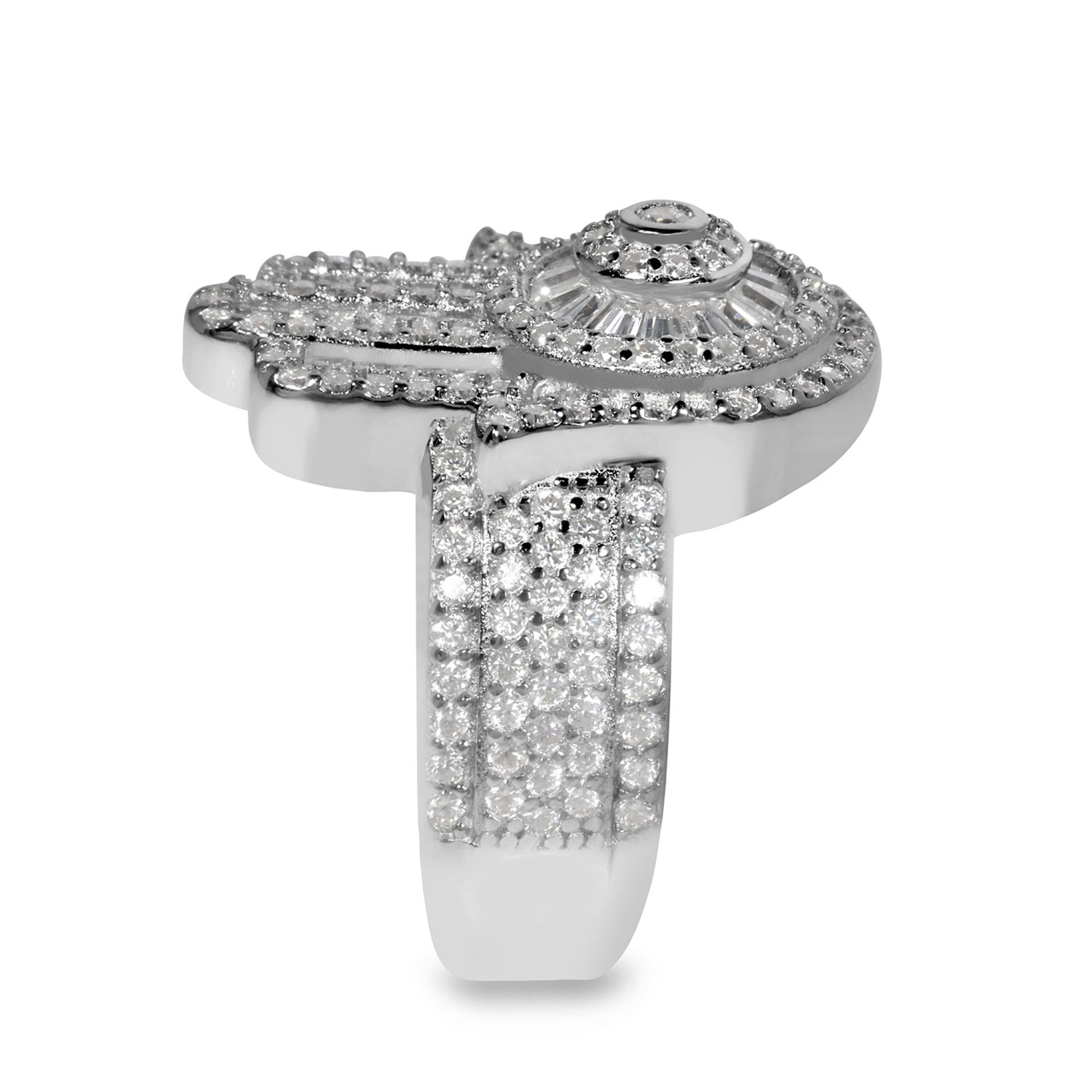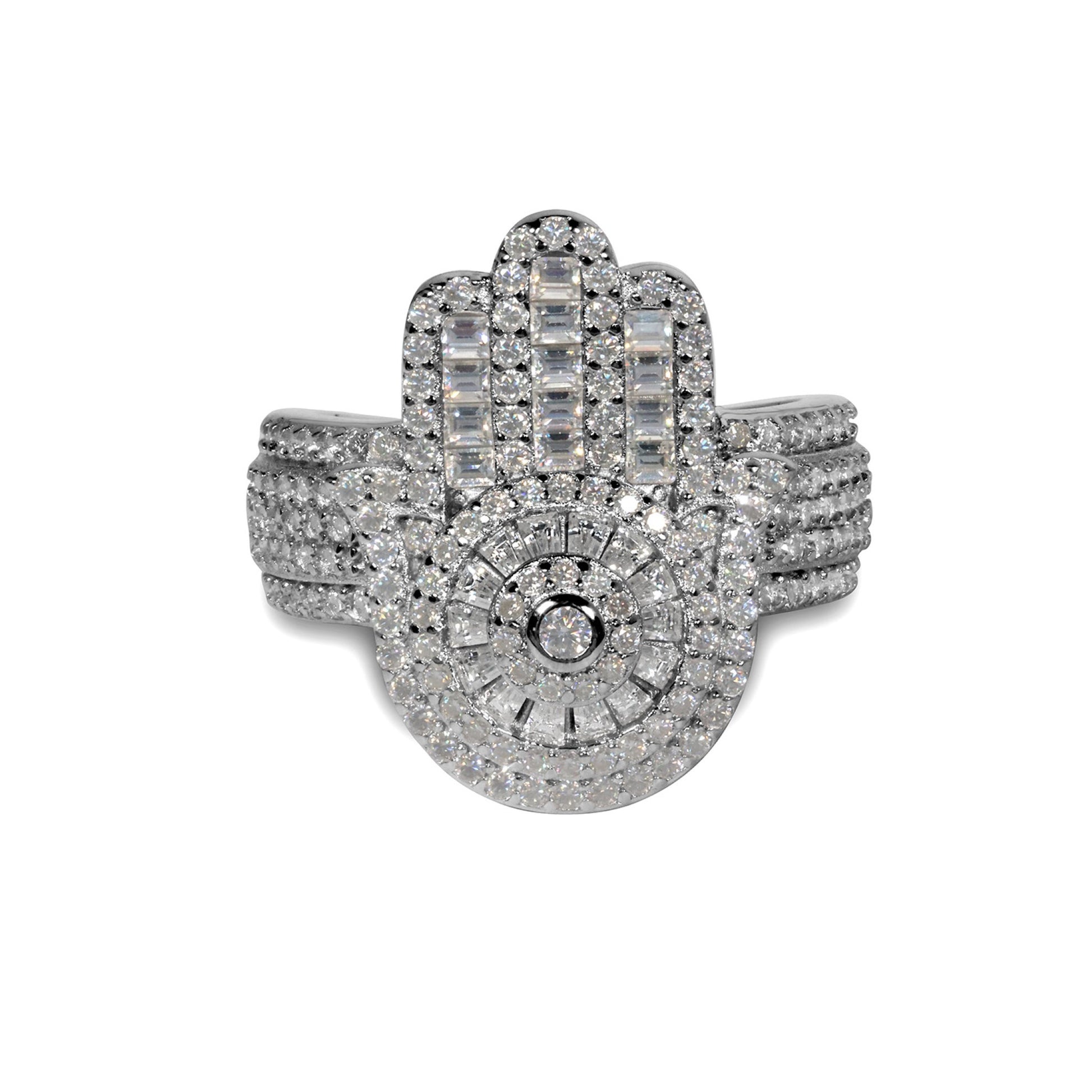 The Hamsa hand has been a symbol known throughout time to bring protection and unity. Our Hamsa ring is set with round moissanite as well as baguette moissanite. Featuring custom baguette cut stones in the center. A truly special take on the popular sign.